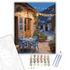 Hegyi Falu Taverna - számfestő készlet – 40×50 cm (Keretre feszítve) A festmény egy hegyi faluban lévő kis tavernát ábrázol, kék székekkel és agyagcserepes fűszernövényekkel. A meleg fényű égősorok a kora esti hangulatot emelik ki, miközben a falak termés