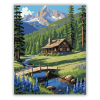 Hegyi Kunyhó és Lila Lupinek - számfestő készlet – 40×50 cm (Keret nélkül) A festmény egy hegyvidéki kunyhót ábrázol, melyet fenyőfák és lila lupinek vesznek körül, miközben egy kis fa híd ível át egy csobogó patak felett. A zöld és lila színek harmóniája