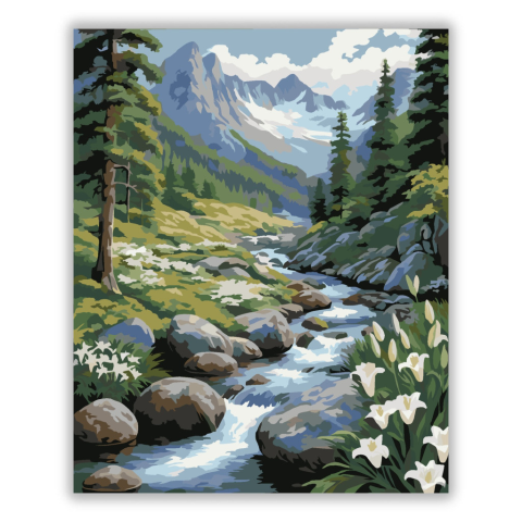 Hegyi Patak és Hófedte Csúcsok - számfestő készlet – 40×50 cm (Keret nélkül) A festmény egy kristálytiszta hegyi patakot ábrázol, amely egy sziklás szurdokon kanyarog át, miközben mohaszőnyeg borította sziklák és fehér liliomok díszítik a partját. A hátté