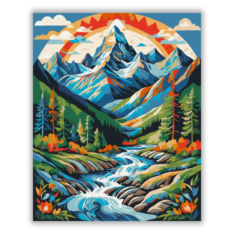 Hegyi Táj Mandala - számfestő készlet – 40×50 cm (Keret nélkül) A festmény egy hegyekkel és folyókkal díszített mandalát ábrázol, melyet élénk és merész színek jellemeznek. A kék, zöld, narancs és vörös árnyalatok dinamikus és vidám hangulatot teremtenek.