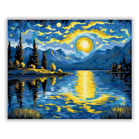 Hegyi Tó Fényjátéka - számfestő készlet – 40×50 cm (Keret nélkül) A festmény egy hegyi tavat ábrázol, amely felett a naplemente varázslatos fényjátéka terül el, Van Gogh stílusában. Az élénk sárga és hűvös kék tónusok kontrasztja, valamint a lendületes ec
