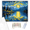 Hegyi Tó Fényjátéka - számfestő készlet – 40×50 cm (Keretre feszítve) A festmény egy hegyi tavat ábrázol, amely felett a naplemente varázslatos fényjátéka terül el, Van Gogh stílusában. Az élénk sárga és hűvös kék tónusok kontrasztja, valamint a lendülete