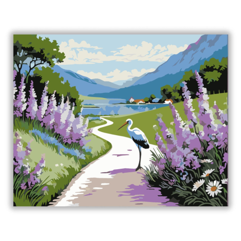 Hegyi Tó Nyugalma - számfestő készlet – 40×50 cm (Keret nélkül) A festmény egy békés vidéki tájat ábrázol, ahol egy gólya sétál a lila virágokkal szegélyezett ösvényen, a háttérben hegyek és egy csendes tó látható. Az élénk, kontrasztos színek és a finom