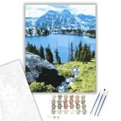 Hegyi tó - számfestő készlet – 40×50 cm (Keretre feszítve) A festmény egy nyugodt, hegyi táj látványát tárja elénk, amely békét és harmóniát sugároz. A kép története a természet csendes szépségéről mesél, ahol a tó vize tükrözi a hegyek fenséges vonulatai