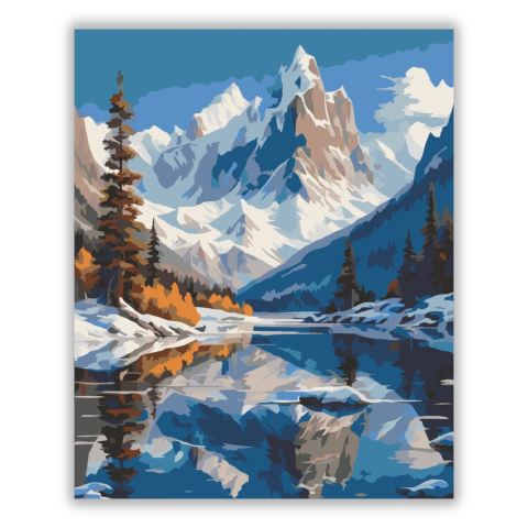 Hegyi Tükröződés Nyugalma - számfestő készlet – 40×50 cm (Keret nélkül) A festmény lenyűgöző hegyvidéki tájat ábrázol, ahol a havas csúcsok tükröződnek a csendes víz felszínén. A művészi stílusra jellemző tiszta színek és finom ecsetkezelés békés harmóniá