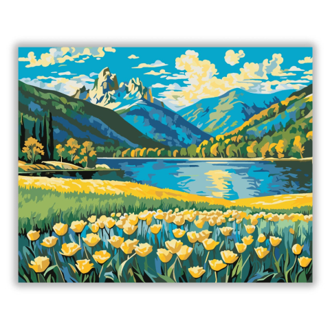 Hegyi Virágok Ébredése - számfestő készlet – 40×50 cm (Keret nélkül) A festmény a hegyek és a virágok találkozását örökíti meg dinamikus ecsetvonásokkal és élénk színekkel. A kék és sárga árnyalatok harmóniája, valamint a lendületes ecsetkezelés élettel t