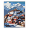 Himalájai Kolostor Fényessége - számfestő készlet – 40×50 cm (Keret nélkül) A festmény egy tibeti kolostort ábrázol a Himalája lenyűgöző hátterével, ahol aranyló tetők tündökölnek a napfényben. A kép gazdag színei és finom részletei a táj misztikus szépsé
