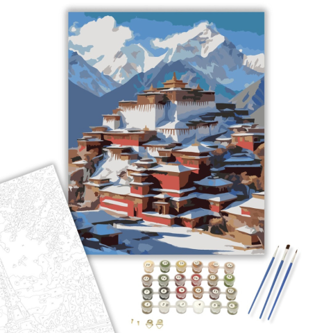 Himalájai Kolostor Fényessége - számfestő készlet – 40×50 cm (Keretre feszítve) A festmény egy tibeti kolostort ábrázol a Himalája lenyűgöző hátterével, ahol aranyló tetők tündökölnek a napfényben. A kép gazdag színei és finom részletei a táj misztikus sz