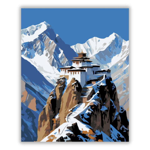 Himalájai Kolostor Ladakhban - számfestő készlet – 40×50 cm (Keret nélkül) A festmény egy távoli himalájai kolostort ábrázol Ladakhban, amely egy sziklafalon helyezkedik el. Az élénk színű imazászlók a szélben lengedeznek, miközben a háttérben hóval borít
