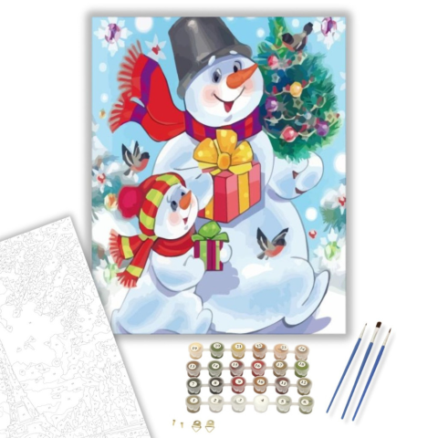 Hóember család - számfestő készlet – 40×50 cm (Keretre feszítve) Készíts gyönyörű műalkotásokat, előzetes festő tudás nélkül! Éld át az alkotás gyönyörű pillanatait és varázslatos hangulatát! Akkor is gyönyörű festményeket hozhatsz létre, ha még nem feste