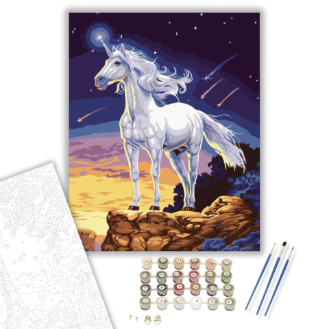 Hófehér Unikornis - számfestő készlet – 40×50 cm (Keretre feszítve) A festmény varázslatos, álomszerű hangulatot áraszt, amely elrepít a mesék világába. Egy rejtélyes történet bontakozik ki a csillagokkal teli égbolt alatt, ahol az unikornis magabiztosan