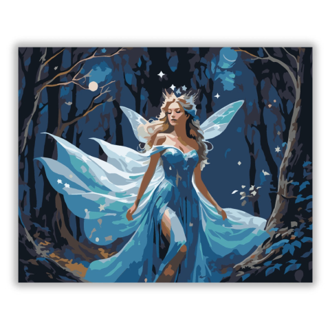 Holdfény Királynője az Erdő Mélyén - számfestő készlet – 40×50 cm (Keret nélkül) A festmény egy tündérkirálynőt ábrázol, aki egy holdfényes erdőben lebeg, ruhája és haja csillagokba olvad. A kék és ezüst árnyalatok varázslatos, éteri hangulatot teremtenek