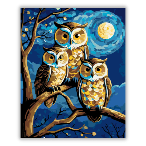 Holdfényes Baglyok Harmóniája - számfestő készlet – 40×50 cm (Keret nélkül) A festmény három baglyot ábrázol egy faágon, a telihold fényében tündöklő éjszakai tájban. A gazdag kék és arany színek, valamint az élénk ecsetvonások erőteljes kontrasztot és mé