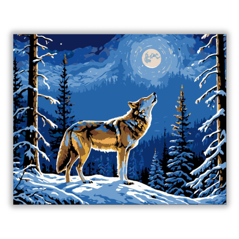 Holdfényes Erdő Szerenád - számfestő készlet – 40×50 cm (Keret nélkül) A képen egy magasztos farkas áll büszkén a hóborította dombtetőn, miközben a hideg éjszakai szél a fák között susog. A színek varázslatos játéka, a fénylő hold kékes árnyalatai, az éj