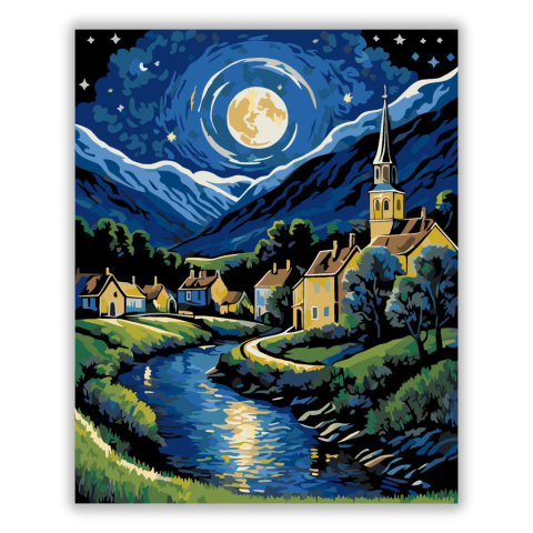 Holdfényes Falu Romantikája - számfestő készlet – 40×50 cm (Keret nélkül) A festmény egy békés falut ábrázol holdfényes éjszakában, ahol a csillagos égbolt és a hegyek körülölelik a tájat. A gazdag kék és sárga árnyalatok, valamint a lendületes ecsetvonás