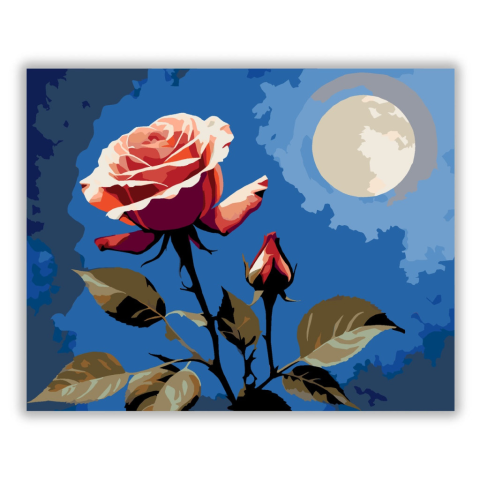 Holdfényes Rózsa - számfestő készlet – 40×50 cm (Keret nélkül) A festmény egy teljes virágzásban lévő rózsát ábrázol, amelyet a háttérben egy ragyogó telihold világít meg. A mély kék égbolt és a rózsa élénk vörös szirmai közötti kontraszt drámai hatást ke