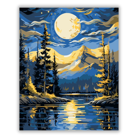 Holdfényes Tavi Nyugalom - számfestő készlet – 40×50 cm (Keret nélkül) A festmény egy csendes, holdfényes tájat ábrázol, ahol a hegyek és a fák tükröződnek a víz felszínén. Az élénk kékek és aranyló sárgák harmonikus kontrasztja, valamint a lendületes ecs