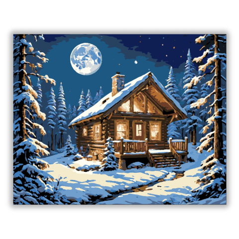 Holdfényes Téli Menedék - számfestő készlet – 40×50 cm (Keret nélkül) Egy magányosan álló faházikó a holdfény alatt hívogat egy varázslatos téli éjszakán. A hóval borított fenyőfák és a csillagok ragyogó fényei környezetében a táj örök nyugalmat áraszt. A