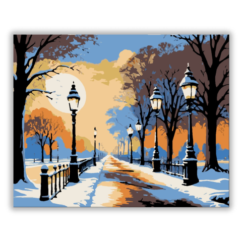 Holdfényes Téli Séta - számfestő készlet – 40×50 cm (Keret nélkül) A kép egy meghitt téli sétányt ábrázol, ahol a lámpák fényei finoman emelik ki a holdfényben fürdő hóval borított tájat. Az aranyló és narancs tónusok különös melegséget árasztanak a hideg