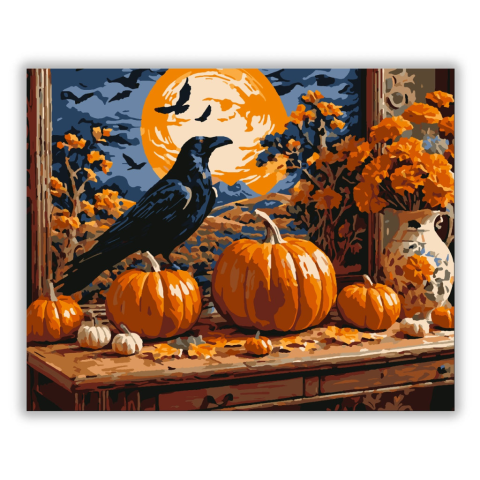 Holló és a telihold varázsa - számfestő készlet – 40×50 cm (Keret nélkül) Ez a festmény egy impozáns hollót ábrázol, amint egy őszi asztalon pihen tökök és narancssárga virágok társaságában. A háttérben feltűnik a lenyűgöző telihold és repkedő hollók, ame