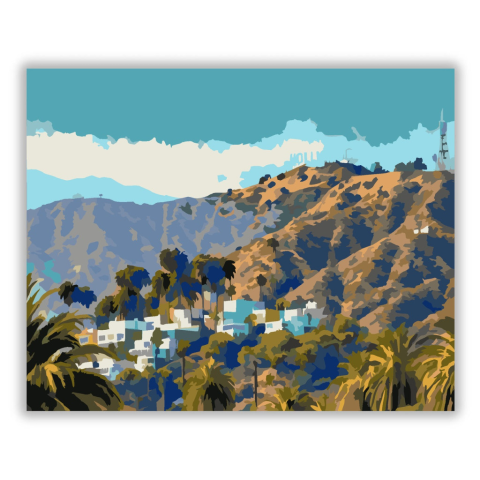 Hollywood Felirat Los Angelesben - számfestő készlet – 40×50 cm (Keret nélkül) A festmény a híres Hollywood feliratot ábrázolja Los Angeles dombjain, pálmafákkal az előtérben és a város párás látképével a háttérben. A színek élénk kék és zöld árnyalatokat