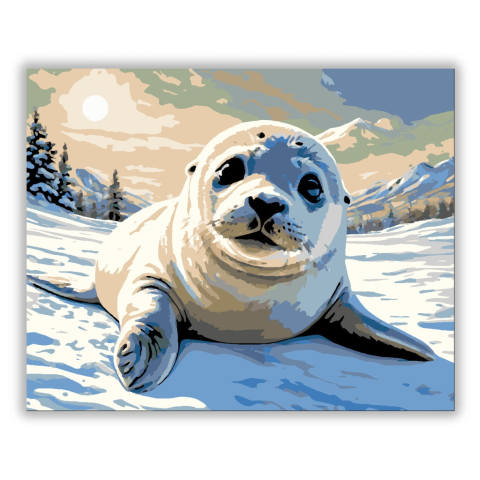 Hómezők Bűbájos Lakója - számfestő készlet – 40×50 cm (Keret nélkül) A kép egy aranyos, fiatal fóka tekintetét örökíti meg egy hóval borított táj közepén. A háttérben égig érő hegyek és behavazott fenyőfák teremtik meg a békés, téli hangulatot. A festés f