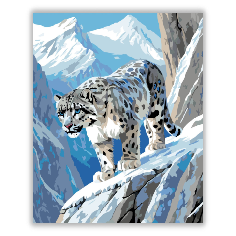 Hópárduc a Himaláján - számfestő készlet – 40×50 cm (Keret nélkül) A festmény egy hópárducot ábrázol, amint egy sziklás himalájai hegygerincen óvatosan lépked. A kép hideg kék és fehér árnyalatai a fagyos táj nyugodt szépségét tükrözik. A jelenet a ragado