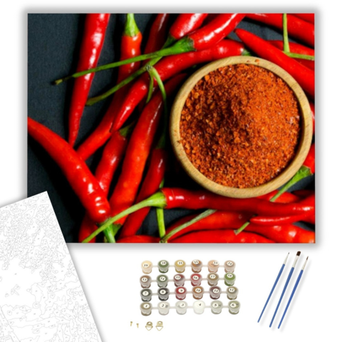 Hungarikum - Paprika - számfestő készlet – 40×50 cm (Keretre feszítve) Készíts gyönyörű műalkotásokat, előzetes festő tudás nélkül! Éld át az alkotás gyönyörű pillanatait és varázslatos hangulatát! Akkor is gyönyörű festményeket hozhatsz létre, ha még nem