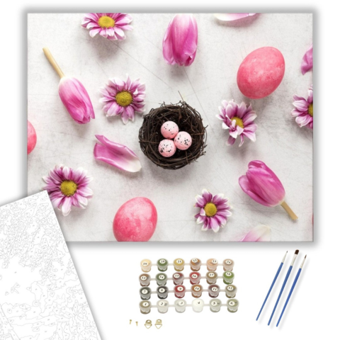 Húsvéti Asztaldísz - húsvéti számfestő készlet – 40×50 cm (Keretre feszítve) Készíts gyönyörű műalkotásokat, előzetes festő tudás nélkül! Éld át az alkotás gyönyörű pillanatait és varázslatos hangulatát! Akkor is gyönyörű festményeket hozhatsz létre, ha m
