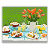 Húsvéti Brunch Asztal - számfestő készlet – 40×50 cm (Keret nélkül) A festmény egy kerti húsvéti asztalt ábrázol, ahol sárgarépatorta, limonádé, tulipánok és dekoratív tojások találhatók. A világos zöld, narancs és sárga színek vidám, ünnepi hangulatot te