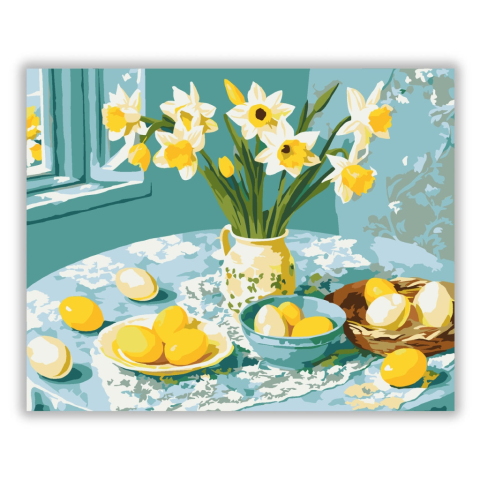 Húsvéti Csendélet Nárciszokkal - számfestő készlet – 40×50 cm (Keret nélkül) A festmény egy húsvéti csendéletet ábrázol, amelyben festett tojások láthatók egy porcelán tálban, csipketerítőn, nárciszokkal díszített váza mellett. A kompozíció világos kék, s