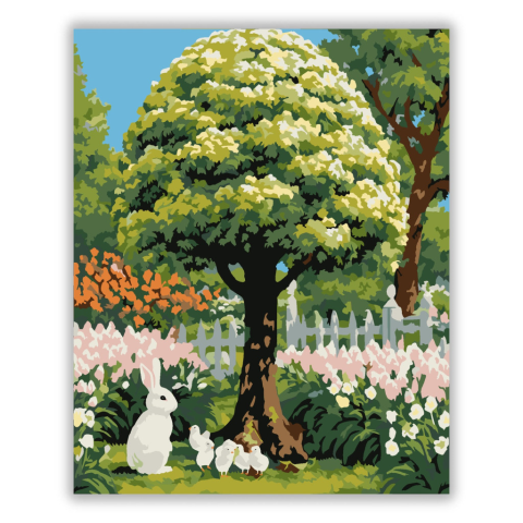 Húsvéti Fa Nyuszival és Csibékkel - számfestő készlet – 40×50 cm (Keret nélkül) A festmény egy húsvéti fát ábrázol a kert közepén, alatta fehér nyuszi és kiscsibék ülnek. A kép élénk zöld, sárga és rózsaszín árnyalatokkal teli, amelyek a tavaszi frissessé