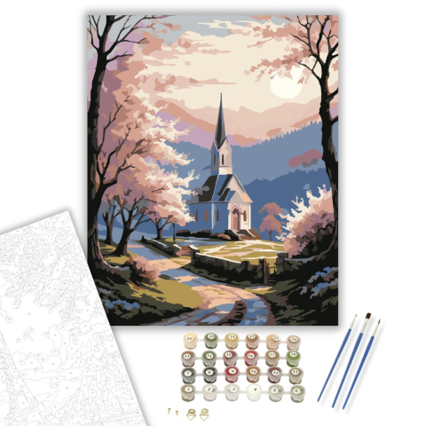 Húsvéti Hajnal a Kápolnánál - számfestő készlet – 40×50 cm (Keretre feszítve) A festmény egy kis kápolnát ábrázol húsvét reggelén, ahol a lágy köd és a virágzó cseresznyefák között gyülekeznek az emberek. A pasztell rózsaszín és kék árnyalatok nyugodt, ta