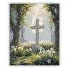 Húsvéti Kereszt és Liliomok - számfestő készlet – 40×50 cm (Keret nélkül) A festmény egy húsvéti reggelen ábrázolja az üres keresztet, melyet liliomok ölelnek körül. A nap sugarai áttörnek a reggeli ködön, meleg aranyfénybe burkolva a jelenetet. A kép az