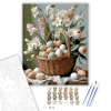 Húsvéti Kosár Tavaszi Virágokkal - számfestő készlet – 40×50 cm (Keretre feszítve) A festmény egy fonott kosarat ábrázol, amely tele van krémszínű, zsálya és rózsaszín árnyalatú tojásokkal, körülötte friss tavaszi virágokkal. A színek természetes és lágy