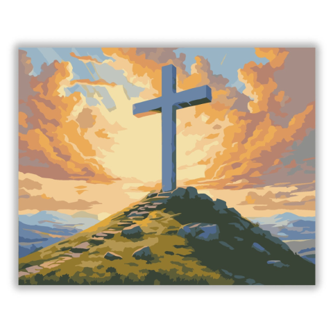 Húsvéti Napkelte Kereszttel - számfestő készlet – 40×50 cm (Keret nélkül) A festmény egy üres keresztet ábrázol, amely egy domb tetején áll, miközben a nap aranysárga fénye áttör a felhőkön. A kép meleg narancs és sárga árnyalatai a tavaszi reggel frisses