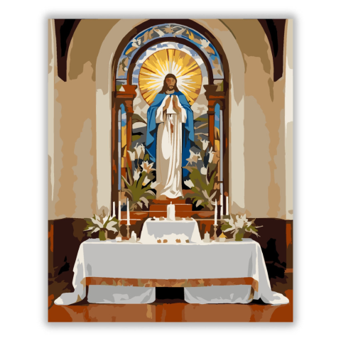Húsvéti Oltár Liliomokkal - számfestő készlet – 40×50 cm (Keret nélkül) A festmény egy templomi oltárt ábrázol, melyet liliomok, fehér terítő, gyertyák és egy feltámadást ábrázoló üvegablak díszít. Az arany és fehér színek eleganciát és ünnepélyes hangula