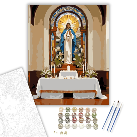 Húsvéti Oltár Liliomokkal - számfestő készlet – 40×50 cm (Keretre feszítve) A festmény egy templomi oltárt ábrázol, melyet liliomok, fehér terítő, gyertyák és egy feltámadást ábrázoló üvegablak díszít. Az arany és fehér színek eleganciát és ünnepélyes han