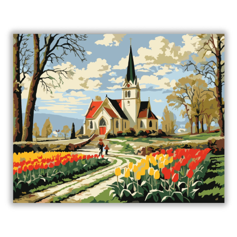 Húsvéti Reggel a Vidéki Templomnál - számfestő készlet – 40×50 cm (Keret nélkül) A festmény egy vidéki templomot ábrázol húsvét reggelén, ahol gyermekek színes kosarakkal sétálnak a tulipánokkal szegélyezett úton. A kép színvilága élénk piros, sárga és zö