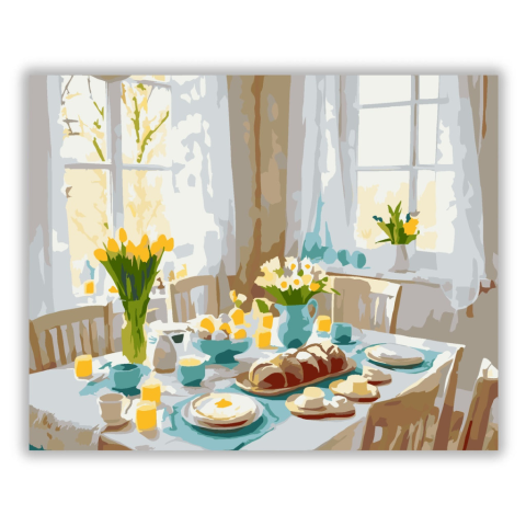 Húsvéti Reggeli Asztal - számfestő készlet – 40×50 cm (Keret nélkül) A festmény egy húsvéti reggelizőasztalt ábrázol, amelyen festett tojások, friss kenyér, tavaszi virágok és égő gyertyák láthatók egy ablak mellett. A színvilág világos sárga, kék és fehé