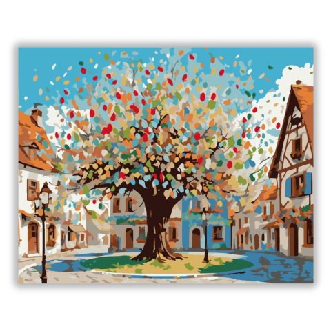Húsvéti Tojásfa a Faluban - számfestő készlet – 40×50 cm (Keret nélkül) A festmény egy bájos falusi tér közepén álló húsvéti tojásfát ábrázol, amelynek ágai színes tojásokkal és szalagokkal vannak feldíszítve. A kép élénk színekben pompázik, mint a piros,