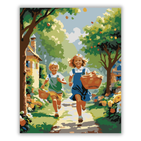 Húsvéti Tojásvadászat Gyermekekkel - számfestő készlet – 40×50 cm (Keret nélkül) A festmény vidám gyermekeket ábrázol, akik húsvéti tojásokat gyűjtenek kosarakba egy falusi kertben. Az élénk színek és a virágzó fák tavaszi frissességet és ünnepi hangulato
