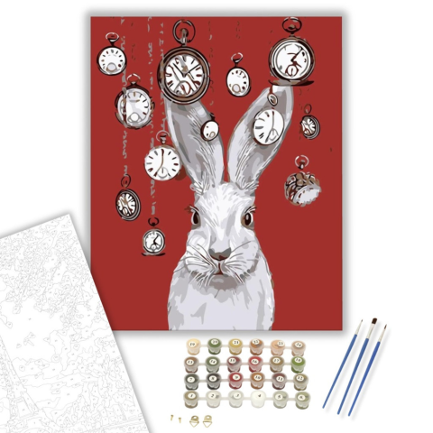 Időnyuszi - számfestő készlet – 40×50 cm (Keretre feszítve) Ez a festmény egy varázslatos utazásra hív, ahol az idő fogalma új értelmet nyer. A kép története egy álomszerű világba vezet, ahol az idő és a tér határai elmosódnak. A vörös háttér élénksége ki