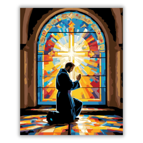 Imádkozó Alak Templomi Ablaknál - számfestő készlet – 40×50 cm (Keret nélkül) A festmény egy térdelő alakot ábrázol, aki imádkozik egy ragyogó kereszt alatti színes templomi ablak előtt. A képen dominálnak a meleg, vibráló színek, amelyek áhítatot és béké
