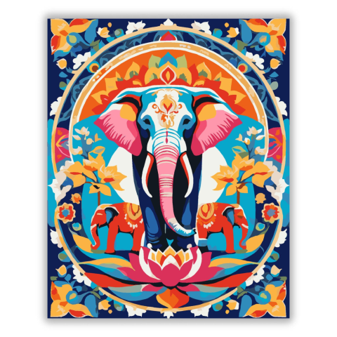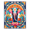Indiai Elefánt és Lótusz Mandala - számfestő készlet – 40×50 cm (Keret nélkül) A festmény egy indiai kultúra ihlette mandalát ábrázol, középpontjában egy díszes elefánttal, lótuszformákkal és virágos díszítésekkel. A képen élénk és merész színek dominálna