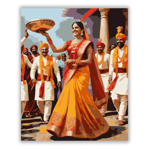 Indiai Esküvői Menet - számfestő készlet – 40×50 cm (Keret nélkül) A festmény egy indiai esküvői menetet ábrázol, ahol a menyasszony piros és arany száriban tündököl, körülötte boldog vendégek és dobosok. Az élénk színek és a virágdíszek ünnepi, örömteli