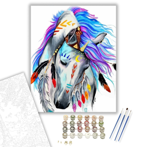 Indián ló - számfestő készlet – 40×50 cm (Keretre feszítve) Ez a festmény egy varázslatos világba repít, ahol a színek életre kelnek. A kép mögött megbúvó történet egy misztikus utazást idéz meg, tele álmokkal és szabadsággal. A vibráló kékek és lilák din