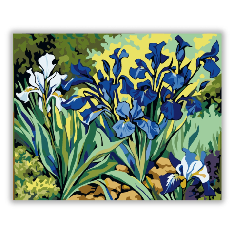 Íriszek Színpompája - számfestő készlet – 40×50 cm (Keret nélkül) A festmény gyönyörű íriszeket ábrázol, amelyek a természet élénk színeit idézik meg. A gazdag kék és zöld árnyalatok lendületes ecsetvonásokkal jelennek meg, kiemelve a stílus jellegzetessé