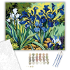 Íriszek Színpompája - számfestő készlet – 40×50 cm (Keretre feszítve) A festmény gyönyörű íriszeket ábrázol, amelyek a természet élénk színeit idézik meg. A gazdag kék és zöld árnyalatok lendületes ecsetvonásokkal jelennek meg, kiemelve a stílus jellegzet