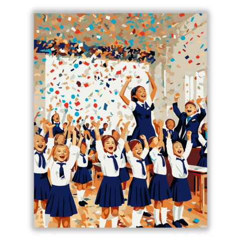 Iskolai Év Végi Ünnepség - számfestő készlet – 40×50 cm (Keret nélkül) A festmény egy vidám iskolai év végi ünnepséget ábrázol, ahol gyerekek csoportos előadást tartanak a színpadon, és papír konfetti hullik a levegőben. A színes konfetti és a lelkes arck